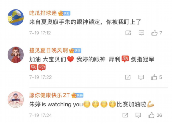 在这张自拍照中,女排队长朱婷的眼神也成了网友关注的焦点:“朱婷is watching you”“我婷眼神犀利,剑指冠军”。