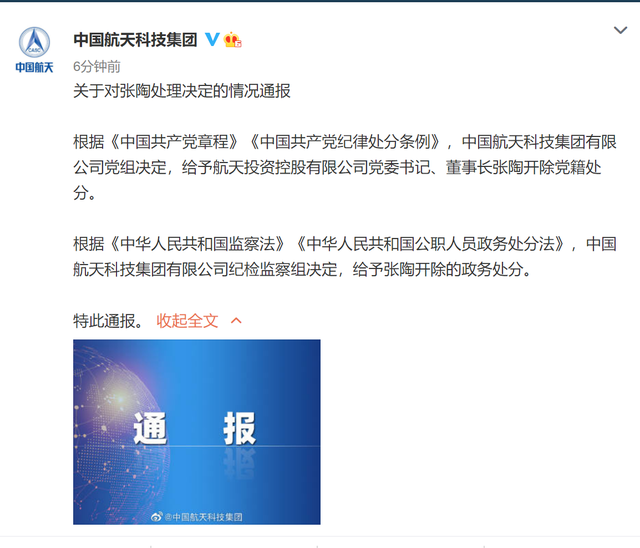 荔枝新闻讯 7月19日晚,@中国航天科技集团 发布关于对张陶处理决定的情况通报。全文如下: