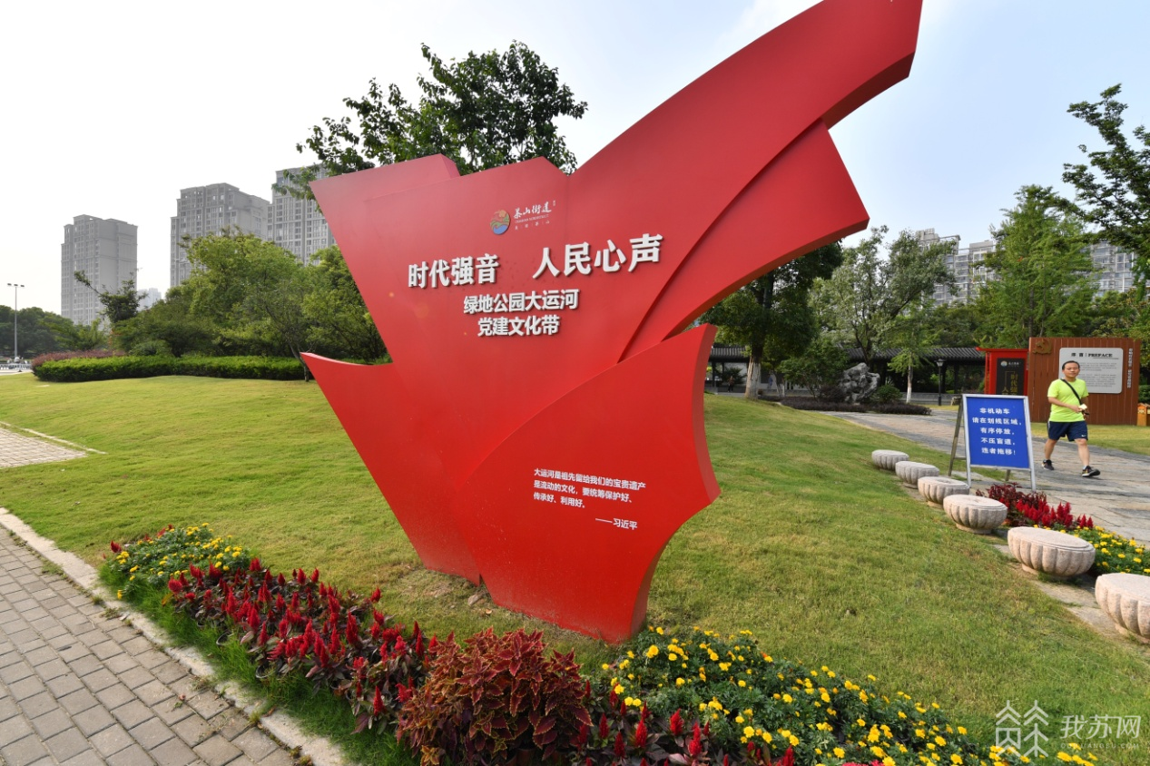 精神堡垒及文化标牌、红歌造型标牌、红色诗词标牌、见义勇为标牌……天宁区的“党建公园”位于大运河畔绿地公园内,园内竖立了4个主题标牌,为大运河文化带增添了一抹亮丽的红色。在天宁区,张太雷纪念馆、绿地公园、中华纺织博览园等红色资源串珠成链,以不同形式分布在运河两岸,形成独具特色的“红色文化地图”。