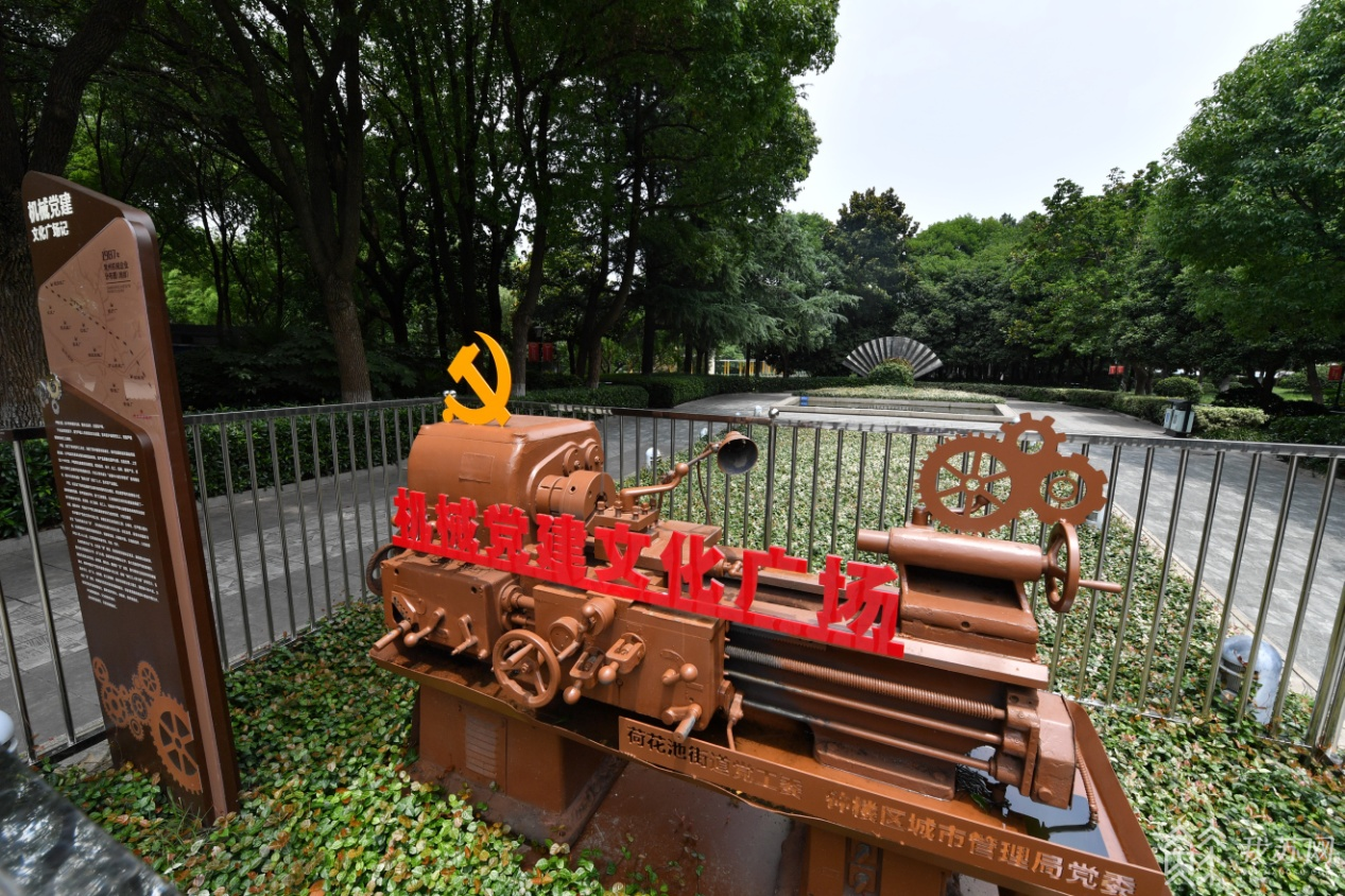 钟楼区机械党建文化广场用机床模型上置党徽作为公园入口标志
