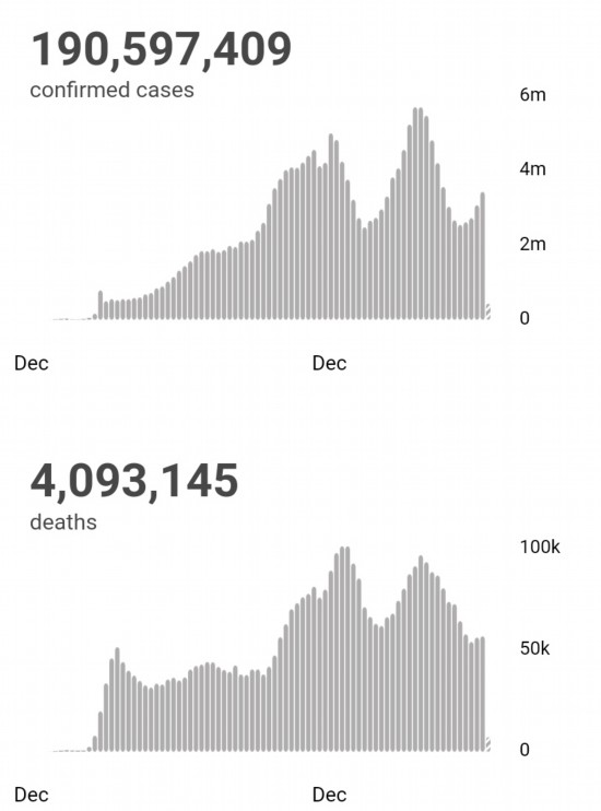 根据世卫组织最新实时统计数据,截至欧洲中部夏令时间7月19日17时42分(北京时间7月19日23点时42分),全球累计新冠肺炎确诊病例190597409例,累计死亡病例 4093145例。19日全球新冠肺炎确诊病例新增427576例,死亡病例新增7145例。