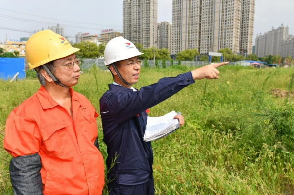 △沈轩宏(右)在淮安东湖商务广场地质勘查现场