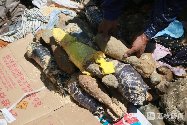 在销毁现场,有关单位已经将掩埋爆炸物的土坑挖掘完毕,核工业南京建设集团的工作人员头戴安全帽,与民警相互配合,将废旧爆破物品卸车、搬运至指定爆炸地点,准备爆破。