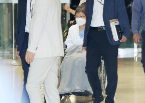现场照片显示,朴槿惠身穿蓝色病号服和白色外套,坐在轮椅上,多人随行。