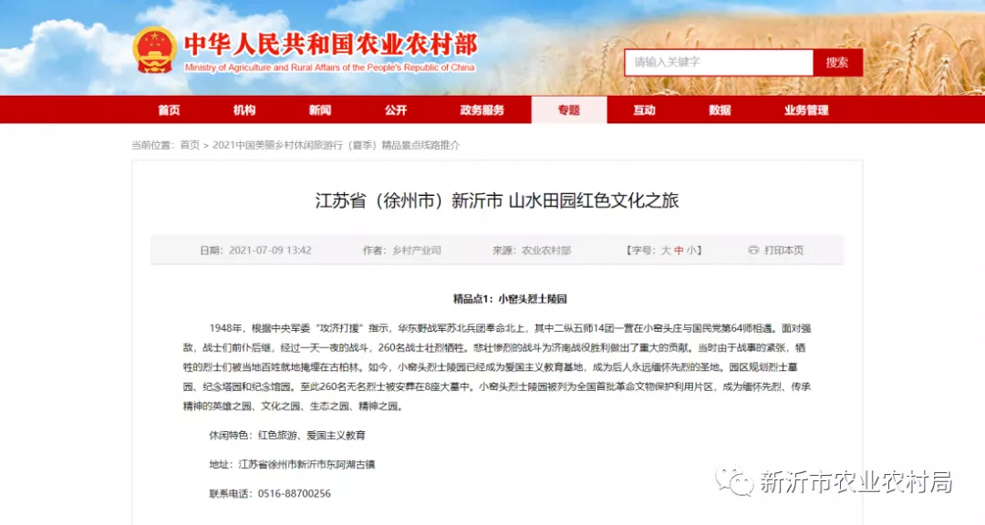 7月16日,农业农村部在新疆伊犁昭苏举办2021中国美丽乡村休闲旅游行(夏季)推介活动,现场发布四川宜宾鹿鸣茶海清凉游等53条夏季精品线路,新沂市申报的新沂市山水田园红色文化之旅成功入选!