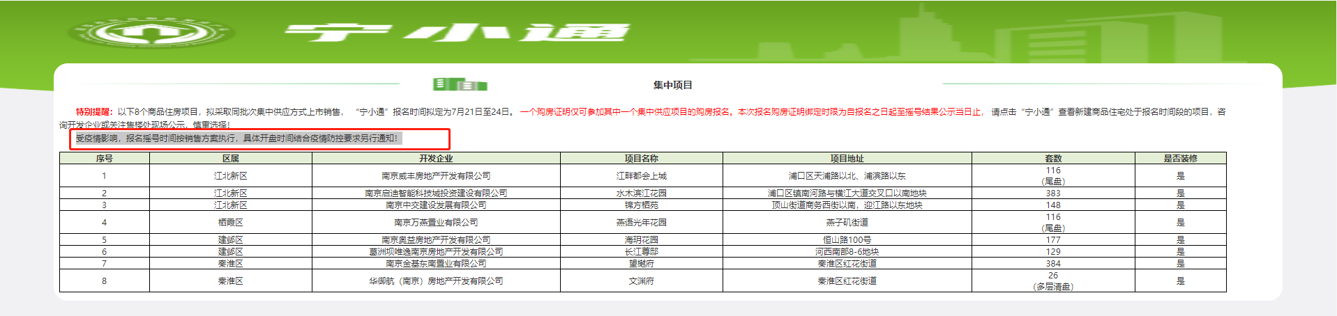 昨天,自南京报名新政后,第一批次集中供应的8个楼盘确定。今天,集中报名项目通知再次更新,“受疫情影响,报名摇号时间按销售方案执行,具体开盘时间结合疫情防控要求另行通知!”