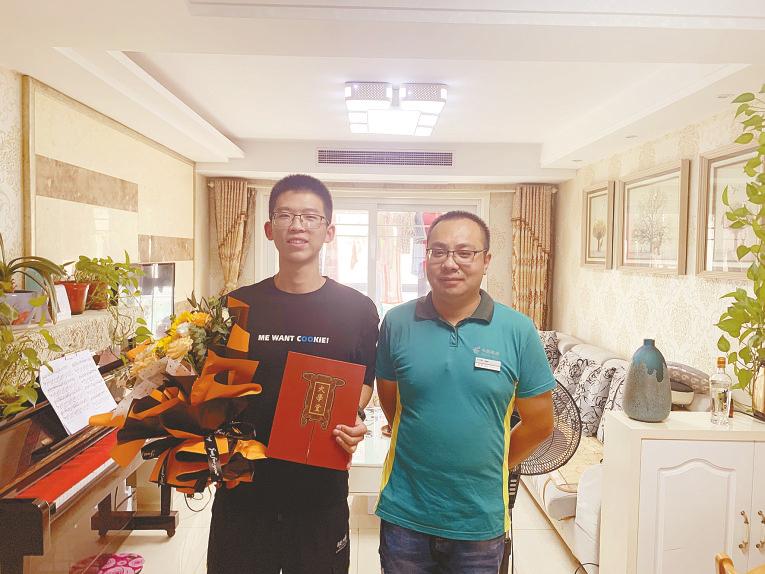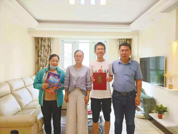 前天一早,在盐城邮政大学城营业投递部,投递员陈磊拨通了徐慕鸿同学的电话,确认本人在家后,提示他提前准备好高考准考证和身份证,签收北大的录取通知书。9:55,陈磊手捧鲜花,敲开了徐慕鸿同学的家门。