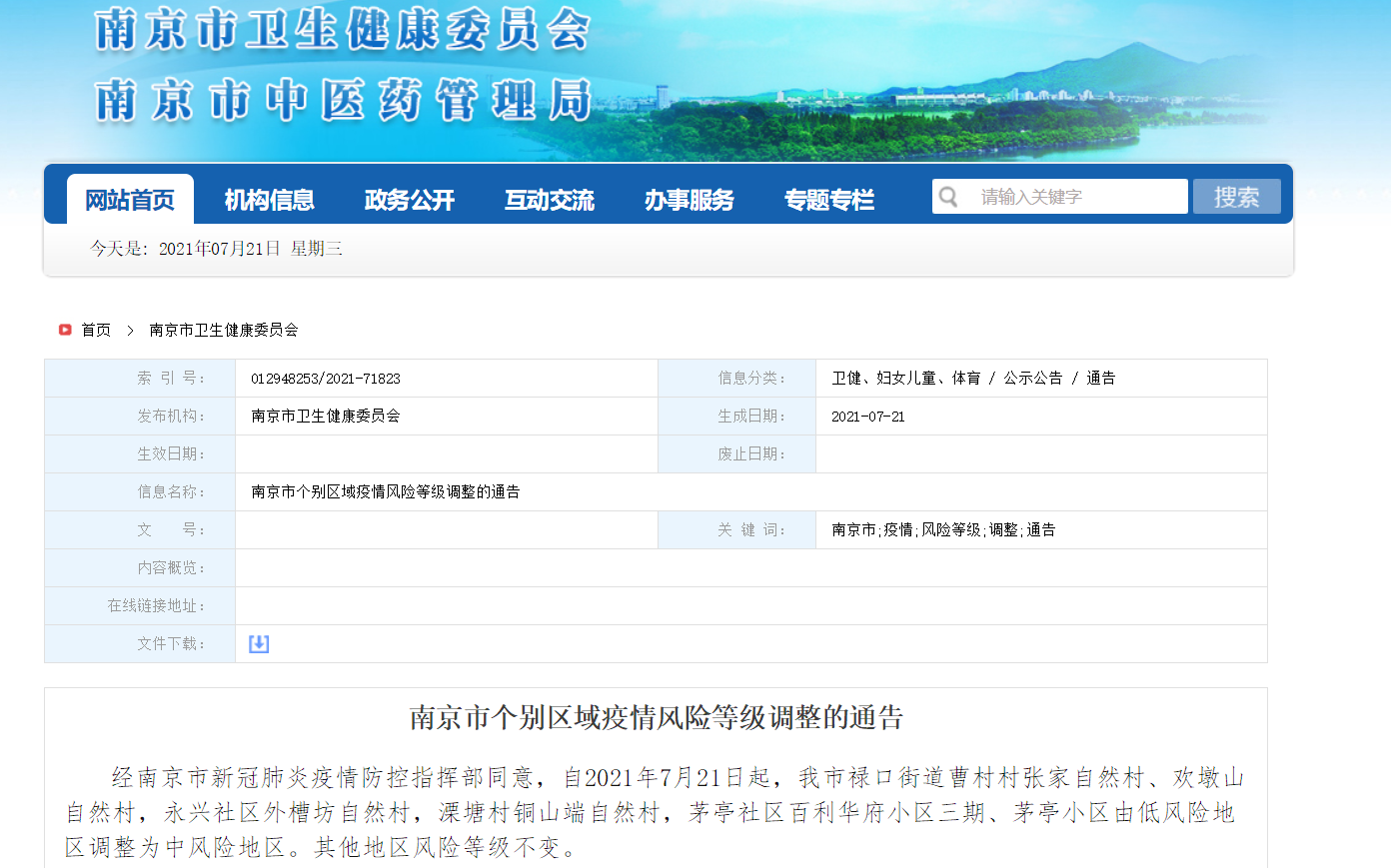 我苏网讯 经南京市新冠肺炎疫情防控指挥部同意,自2021年7月21日起,南京市禄口街道曹村村张家自然村、欢墩山自然村,永兴社区外槽坊自然村,溧塘村铜山端自然村,茅亭社区百利华府小区三期、茅亭小区由低风险地区调整为中风险地区。其他地区风险等级不变。