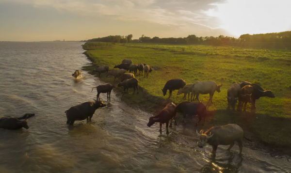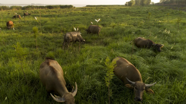 飞鸟蹁跹,水牛亲水……这样的和谐之变,在海门长江段越来越多地发生着。