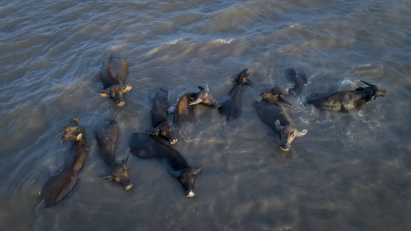 芦苇荡中,十多头大水牛悠闲自在地踱步、吃草。江天辽阔,江水浩荡,酷暑难耐,水牛下水在长江中亲水嬉戏。