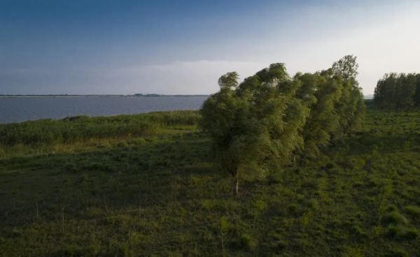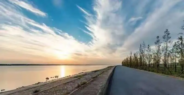 夕阳西下,长江边江风吹拂,绿树飘扬。