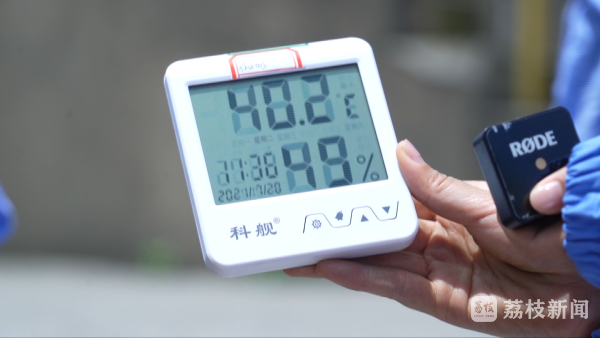 检测人员手持超声波测厚仪和耦合剂,细致地检测着罐顶每一处腐蚀,太阳的威力让温度计实时数据不断刷新,罐顶温度一度高达48.2℃。
