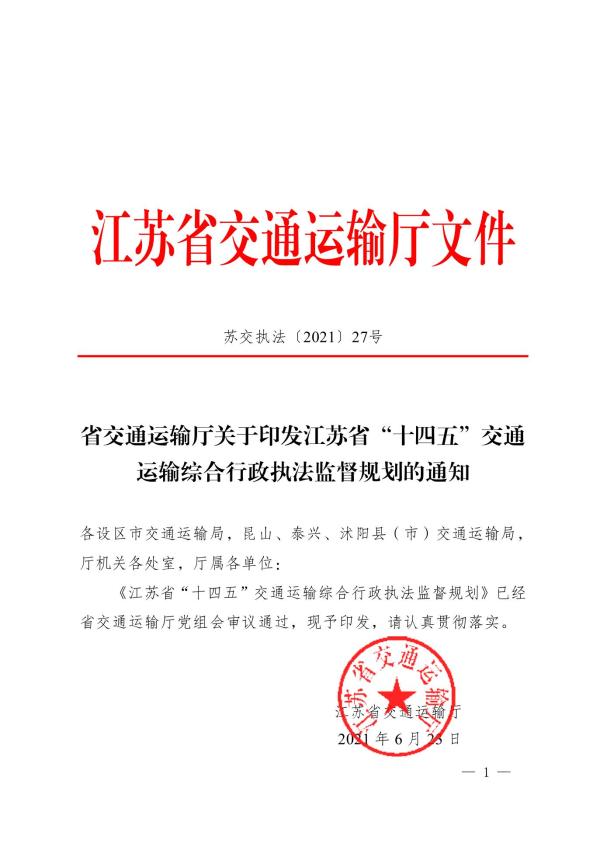 近日,江苏省交通运输厅印发《江苏省“十四五”交通运输综合行政执法监督规划》(以下简称《规划》),该规划是在全国省级层面交通运输综合行政执法领域的率先探索,填补了交通运输行业相关领域的规划空白,同时也是综合行政执法改革后首个正式发布的省级综合执法“十四五”规划。