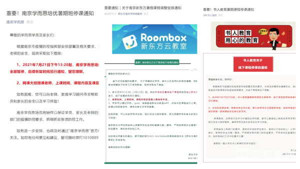 7月21日,南京市新型冠状病毒肺炎疫情防控工作指挥部发布通告,要求严格控制各类聚集性活动,会议、培训、活动尽量采取线上方式,尽量减少线下大型活动。从当天开始,南京多家培训机构陆续发布线下停课通知。