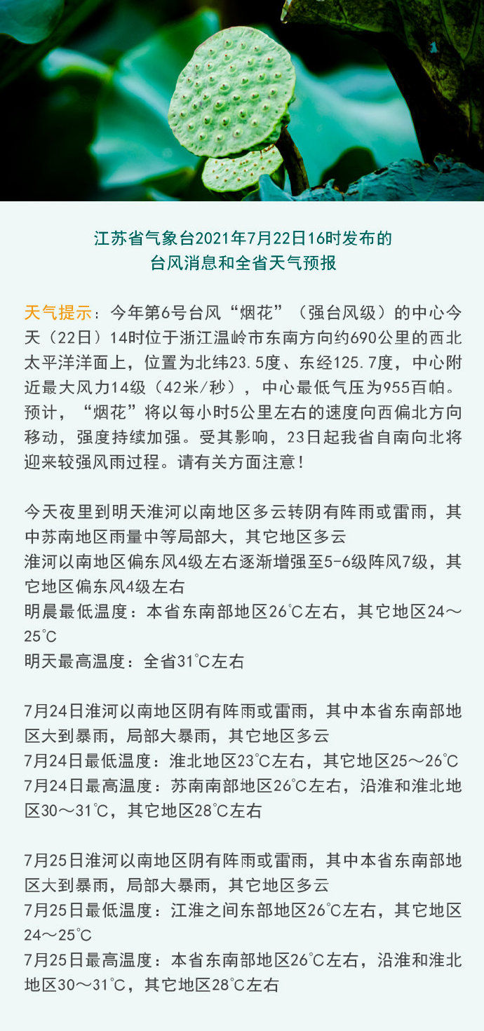 据江苏省气象台消息,今年第6号台风“烟花”(强台风级)的中心今天(22日)14时位于浙江温岭市东南方向约690公里的西北太平洋洋面上,位置为北纬23.5度、东经125.7度,中心附近最大风力14级(42米/秒),中心最低气压为955百帕。预计,“烟花”将以每小时5公里左右的速度向西偏北方向移动,强度持续加强。受其影响,23日起我省自南向北将迎来较强风雨过程。请有关方面注意!