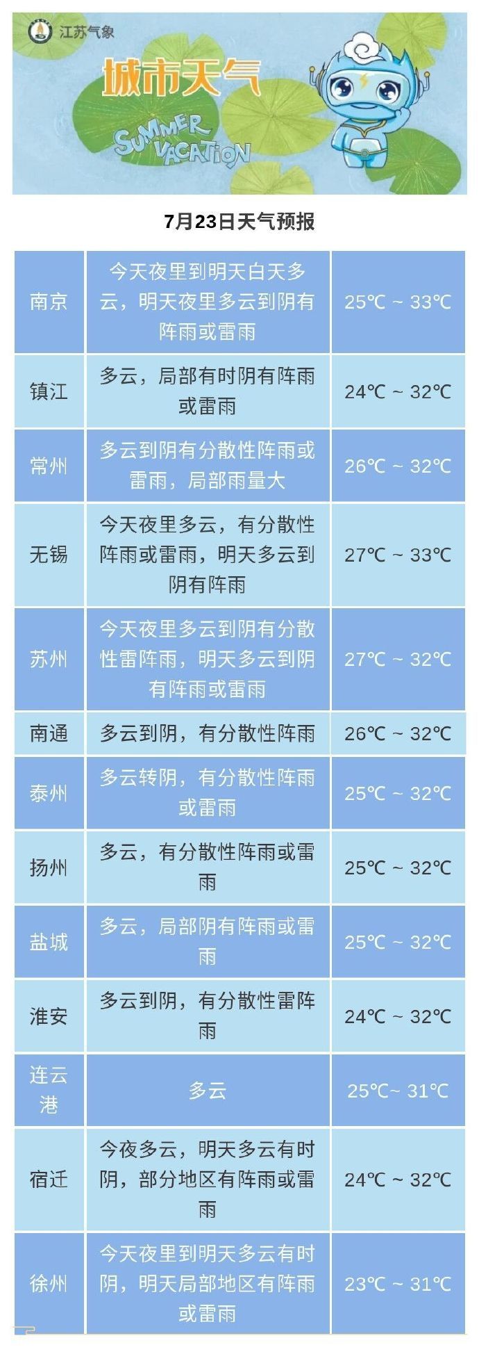 今天夜里到明天淮河以南地区多云转阴有阵雨或雷雨,其中苏南地区雨量中等局部大,其它地区多云;淮河以南地区偏东风4级左右逐渐增强至5-6级阵风7级,其它地区偏东风4级左右;明晨最低温度:本省东南部地区26℃左右,其它地区24~25℃;明天最高温度:全省31℃左右。