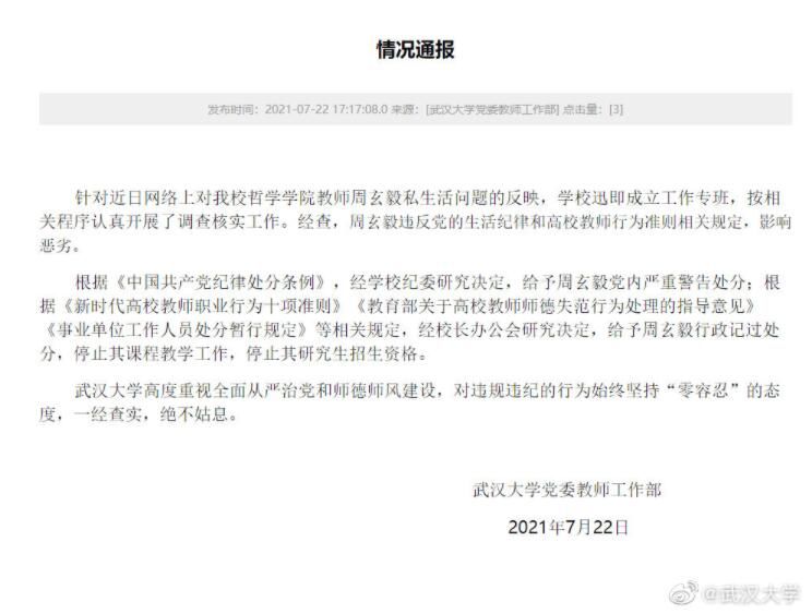 荔枝新闻讯 据“武汉大学”微博消息,经查,周玄毅违反党的生活纪律和高校教师行为准则相关规定,影响恶劣。