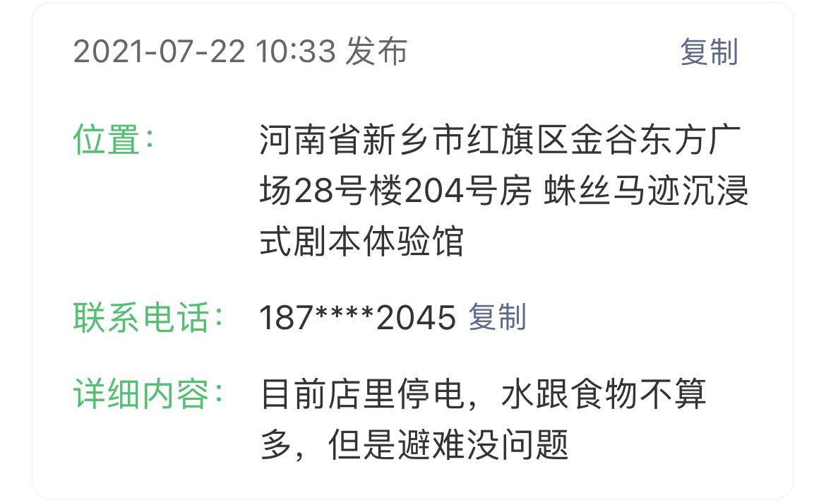 信息发布者 剧本体验馆工作人员:我们店因为暴雨断电,但是店的面积比较大,容纳20人来避险是没有问题的。22日凌晨五点的时候有一个救援队过来整顿了一下,我们店里21日夜里留了4个男孩子帮助来店里休息的人,店里是可以打地铺休息的,但是救援队不愿意休息。