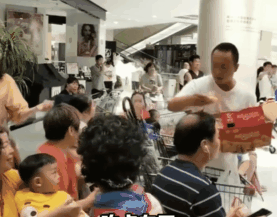 7月21日在河南新乡,大量市民被困商场,工作人员免费送上食物并暖心安慰。