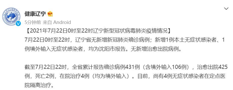 荔枝新闻讯 据辽宁卫健委官方微博消息,7月22日0时至22时,辽宁省无新增新冠肺炎确诊病例;新增1例本土无症状感染者、1例境外输入无症状感染者,均为沈阳市报告。无新增治愈出院病例。