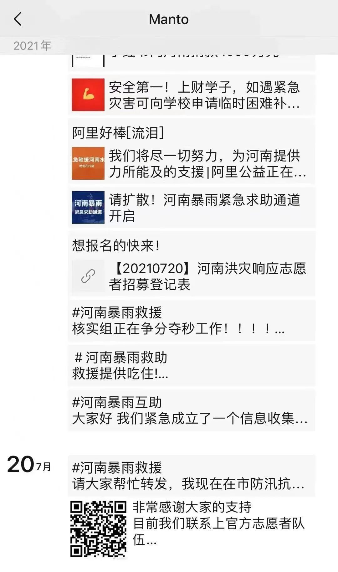 manto的朋友圈里,全是与“救援抢险“相关的动态