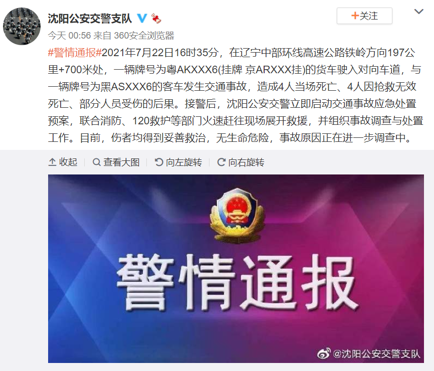 7月23日凌晨,辽宁省沈阳市公安局交警支队在其官方微博上通报,2021年7月22日16时35分,在辽宁中部环线高速公路铁岭方向197公里+700米处,一辆牌号为粤AKXXX6(挂牌 京ARXXX挂)的货车驶入对向车道,与一辆牌号为黑ASXXX6的客车发生交通事故,造成4人当场死亡、4人因抢救无效死亡、部分人员受伤的后果。接警后,沈阳公安交警立即启动交通事故应急处置预案,联合消防、120救护等部门火速赶往现场展开救援,并组织事故调查与处置工作。目前,伤者均得到妥善救治,无生命危险,事故原因正在进一步调查中。