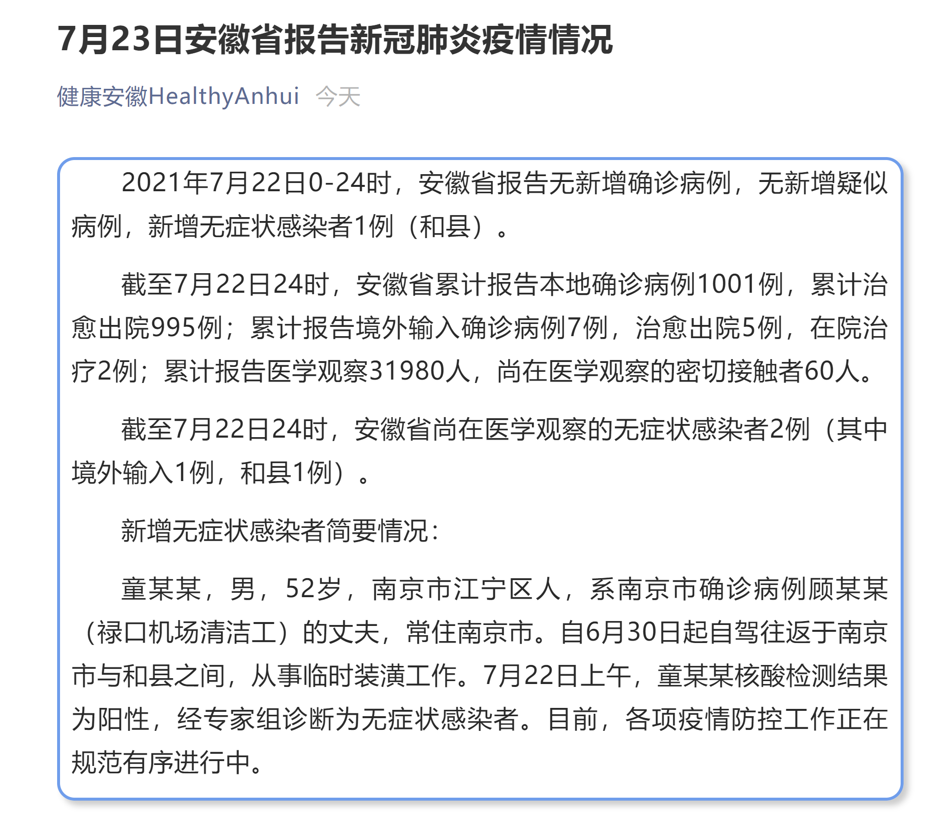 童某某,男,52岁,南京市江宁区人,系南京市确诊病例顾某某(禄口机场清洁工)的丈夫,常住南京市。自6月30日起自驾往返于南京市与和县之间,从事临时装潢工作。7月22日上午,童某某核酸检测结果为阳性,经专家组诊断为无症状感染者。目前,各项疫情防控工作正在规范有序进行中。