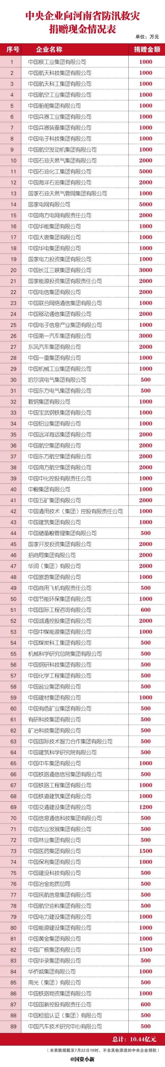据国资委新闻中心官微通报,国资委和中央企业坚决贯彻落实习近平总书记关于防汛救灾的重要指示精神,落实党中央、国务院决策部署,全力支援河南省做好汛灾抢险救援,进一步加大捐赠力度,截至7月22日19点,89家中央企业累计向河南省捐赠现金达10.44亿元(不含其他渠道的中央企业捐款)。