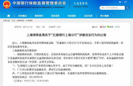 上海银保监局网站7月22日发布公告称,近日,上海银保监局发现有媒体报道称,“红旗银行上海分行”在沪挂牌成立,并将开展所谓贷款融资、国际贸易结算等业务。