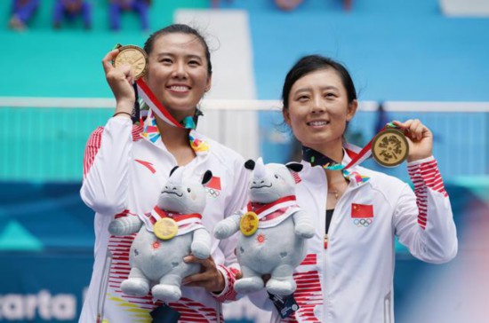 2018年8月25日,徐一璠/杨钊煊(左)在第18届亚运会网球女双领奖台上。新华社记者程敏摄