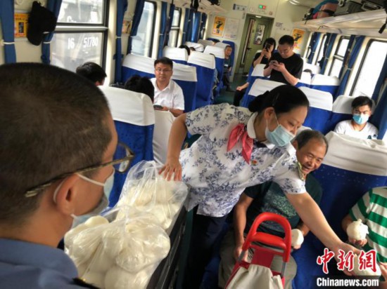 图为工作人员为乘客送上馒头。 张雁南 摄