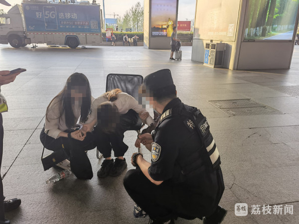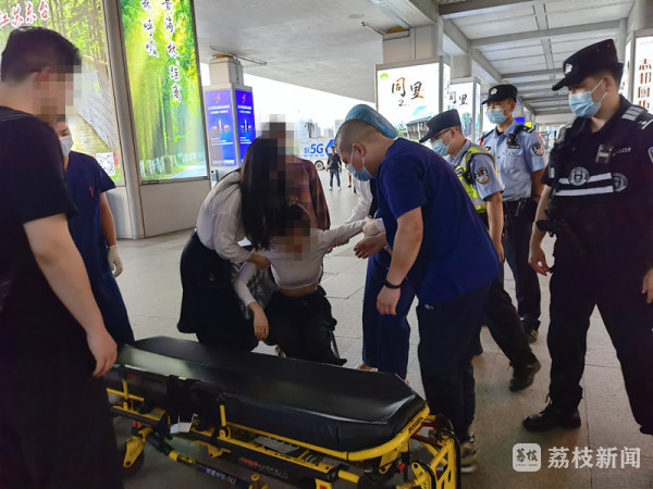 7月20号晚上6点多,南京市公安局特警支队武装巡逻一大队民警正在南京南站北广场巡逻值守时,发现在自动扶梯边两名年轻女子正扶着躺倒在地的另一名女子。躺着女子脸色苍白,眼神迷离,手脚抽搐,虚弱无力,两名同伴在不停呼唤,女子虽有一定意识,却迟迟无法应答,见此情况民警迅速上前询问情况,并开展救助。
