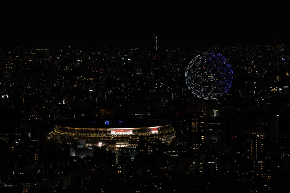这是7月23日拍摄的开幕式上新国立竞技场上空的无人机表演。新华社记者 徐子鉴 摄