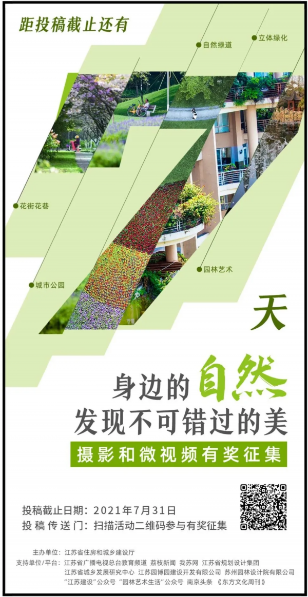 参赛作品围绕#身边的自然 发现不可错过的美#主题进行拍摄,作品表现地域为江苏省范围内,拍摄对象包括但不限于公园、绿道、游园绿地、庭院露台、花街花巷、立体绿化....创作灵感不设限,绿意就在你身边。