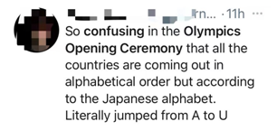 “奥运开幕式太迷惑了,所有国家是按照字母表顺序出场的,但却是日本字母表。直接从A跳到U了。”