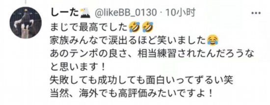 “真的棒极了,一家人一起看时大家都笑出眼泪了。那个超强节奏感,我想是在练习时下了很大功夫吧!不管成功了还是失误了都引人发笑。当然,在日本国外看起来也获得了好评。”