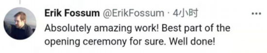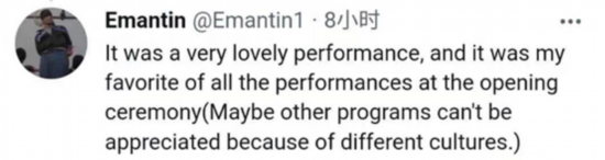 还有网友说,“绝对惊艳的表演!当然这是开幕式最好的部分。做得好!”。↓