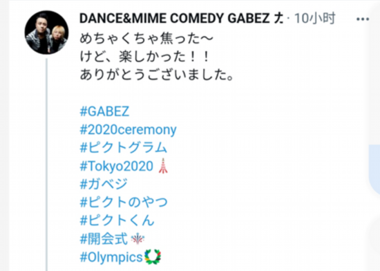 【环球网报道 见习记者林泽宇】在23日晚举行的东京奥运会开幕式上,现场演绎50个奥运项目图标的“超级变变变”环节受到众多网友的好评,在网络上有很多声音评价其为“开幕式上最有趣的环节”。演绎了该环节的哑剧艺人组合“GABEZ”24日凌晨更新了自己的推特,发文称,在表演的时候“忙得焦头烂额,但是(表演时)很开心”,并对网友的称赞表示感谢。↓
