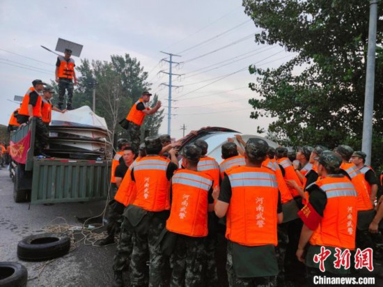 当日近23时,武警河南总队机动支队官兵给记者发来一组照片和视频,该队官兵在新乡市牧野区卫河河畔上封堵缺口。