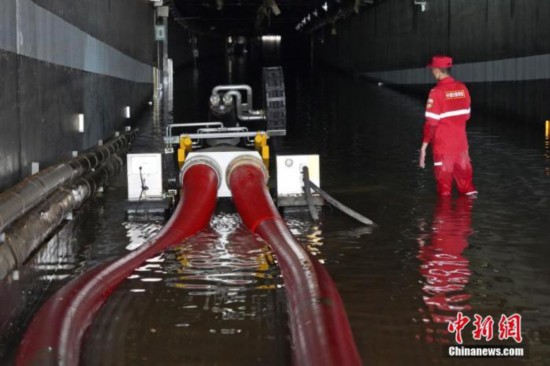 资料图:“龙吸水”机器人在河南省郑州市京广路隧道进行排涝作业。 中新社记者 李超庆 摄