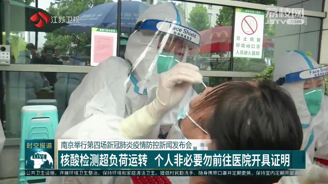 目前,南京共有43家医疗机构,13家疾控机构,以及20家第三方检测机构具有核酸检测能力,1天的检测能力能够达到35万份,混采能够达到350万人,目前都已超负荷运转。因此呼吁广大市民,非必要尽量不要前往医院开具个人核酸检测证明。