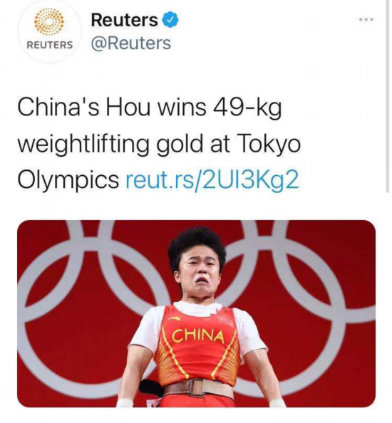 如图所示,路透社推文中的配图选了一张侯志慧正在用力时的图片,表情显得极不自然。这则推特下面很快有网友注意到了这点,质疑说:“你们没有其他照片来报道这事了吗?”↓