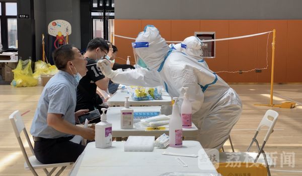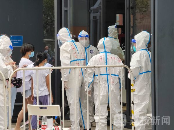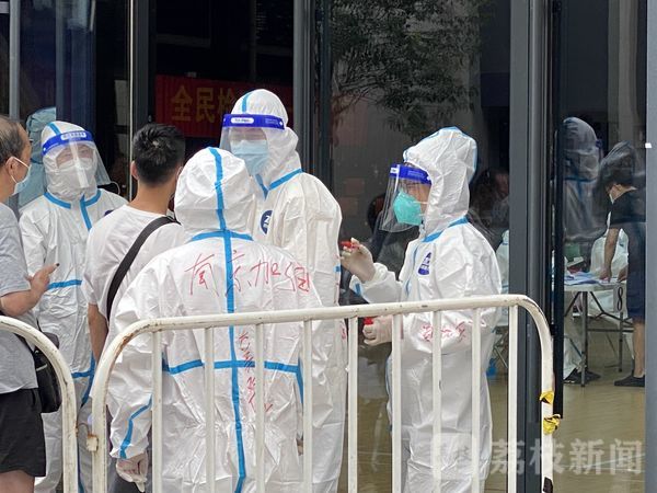 7月24日上午10点,作为秦淮区专门采集点之一,悦动·新门西产业园门西球馆迎来人流高峰,前来采样的市民按照防控安排有序排队入场。在检测大厅入口处,几位志愿者忙着查验核酸检测通知单,在工作间隙中,一位志愿者在同伴的防护服背后写上了“南京加油”几个大字,互相打气。