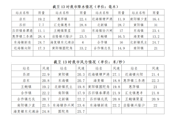 二、降水、风力实况 受“烟花”外围影响,24日起我市有明显风雨天气。截止今天下午13时我市普降中到大雨,最大雨量33.2毫米,出现在寅阳镇圆陀角。我市大部分地区风力达到9级,三个站点风力达到10级,极大风速在近海镇塘芦港(27.1米/秒)。