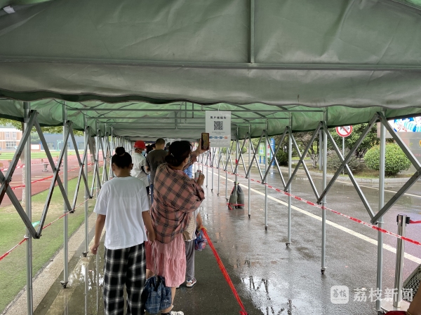 一来到位于南京市江宁区天云社区上坊小学核酸采样点,就能听到循环播放提醒。附近居民冒着雨主动前来进行核酸检测。一进校门,临时帐篷搭成的风雨长廊直接连通教室走廊,由现场志愿者不间断地进行引导。提前扫码、完成采样码登记站在一队,由工作人员进行扫码登记。没有智能手机的居民用身份证进行登记后站成一队,大大加快了效率,检测完从另一侧的校门直接出校园,整个过程秩序井然。