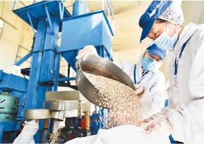 西藏自治区洛隆县洛宗特色产品开发公司生产的青稞特色产品在拓宽销路的同时,为当地群众增加就业岗位。目前,该公司提供45个就业岗位,与洛隆县1000余户青稞种植户签订了青稞收购合同。图为公司员工将烘炒好的青稞装袋。新华社记者 李 鑫摄