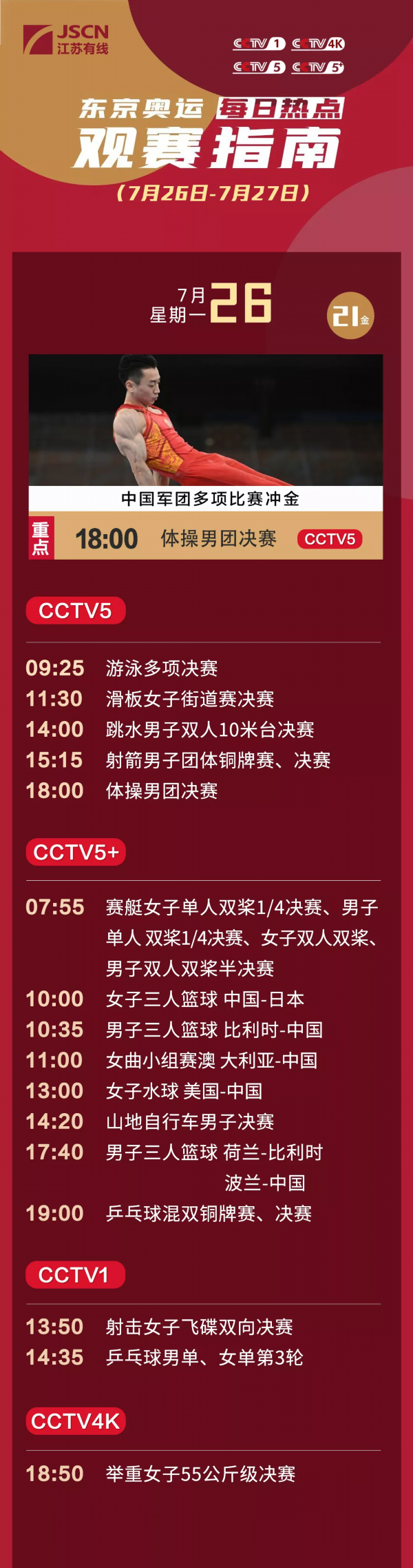 7月26日晚,本届奥运会首枚体操金牌将在有明体操馆进行的男子团体决赛上诞生。
