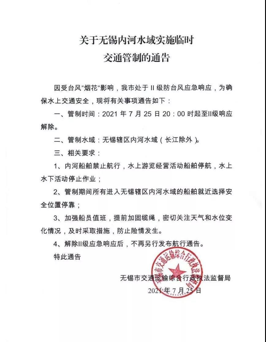 无锡交通应急指挥中心自7月25日20时起发布通告,据悉,本次内河封航涉及京杭运河(无锡段)、锡澄运河、锡十一圩线等无锡城区内河水域。