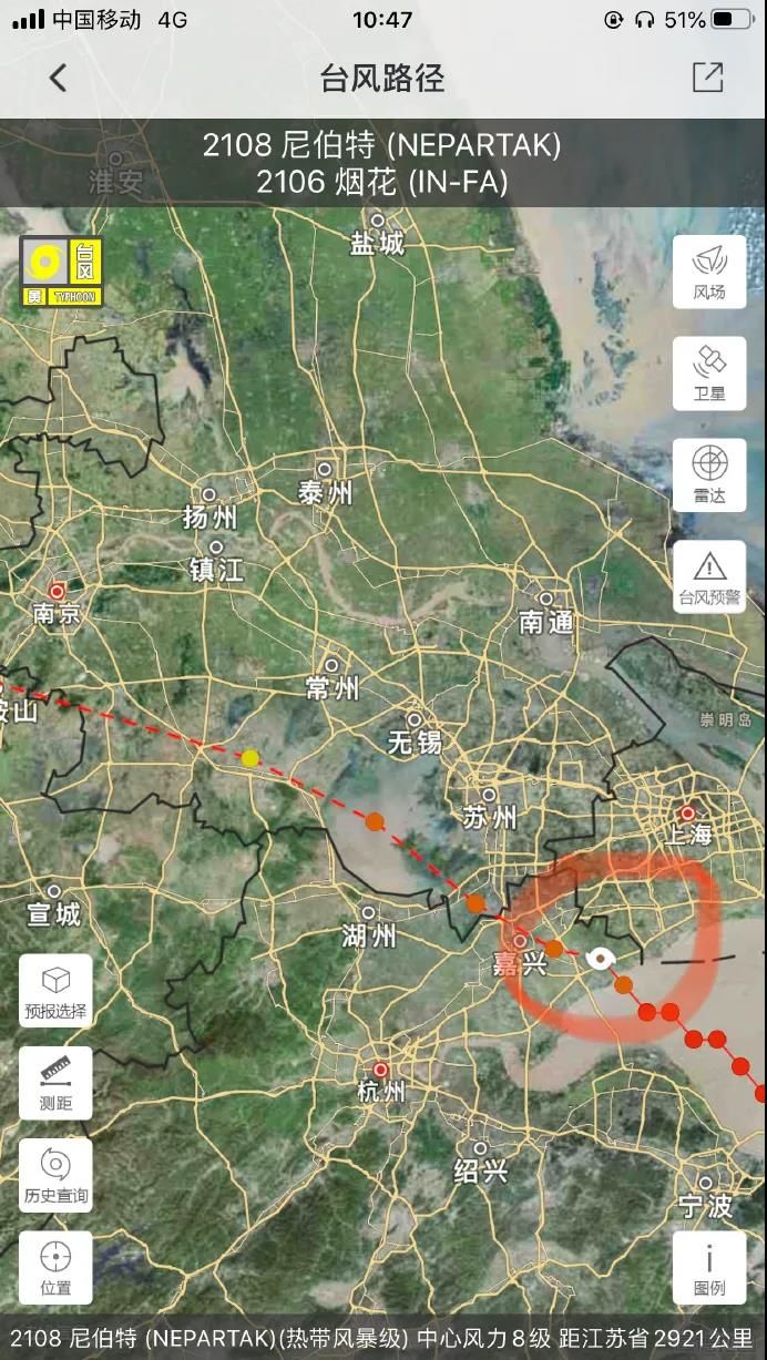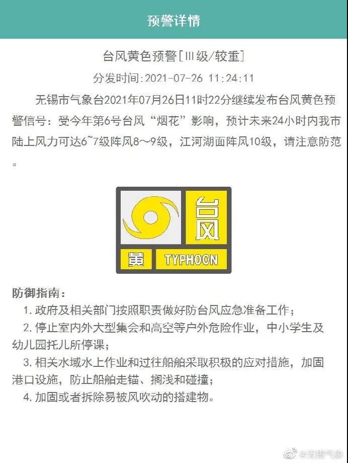 今年第6号台风“烟花”已于7月26日9时50分左右在浙江平湖二次登陆,近中心最大风力11级(30米/秒,强热带风暴级),距离无锡市约130公里,台风“烟花”将继续向西北方向移动,将于26日夜晚穿越太湖。