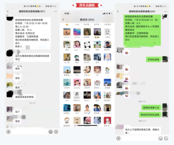 7月21日上午,疫情防控志愿者招募工作一经启动,在宁机关、企事业单位、高校团组织迅速发动团员青年、骨干志愿者报名参与志愿服务。有的核酸检测站点建群二维码一公布,不到十分钟就招满,志愿者一小时内就全部到岗。当天下午,南京各区青年志愿者就已奋战在一线。